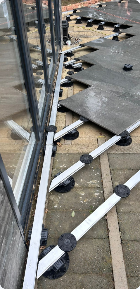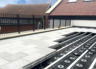 Suspending the slabs creates an air gap which helps ventilate the deck beneath. Drainage water has a clear channel in which to flow so no blockages should occur.