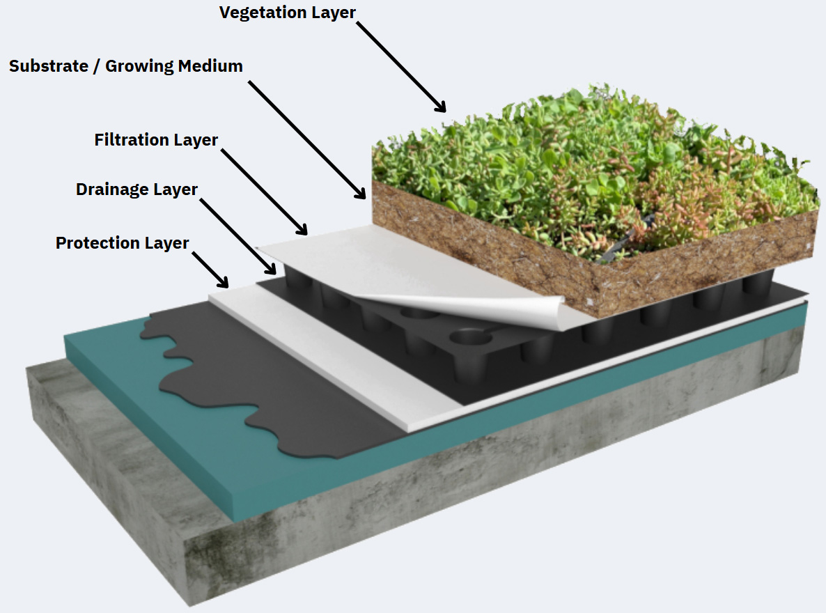 The first layer of the eco-roof lays against the existing structure of the roof. It is there to seal the building and prevent any water from leaking inside. It's either a synthetic material or a metal layer. The next layer is a drainage layer which allows some degree of water to properly escape the roof.
