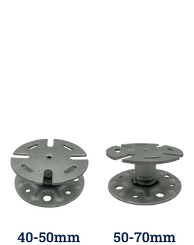 The support pads come in four parts: the base plate, a threaded stem, a nut fixing and the head plate complete with positioning lugs. The nut fixing is simply screwed onto the stem and rotated up or down to change the height. In this way, very exact and irregular changes to the deck level can be achieved. The stems have a range of up to 35mm at each
