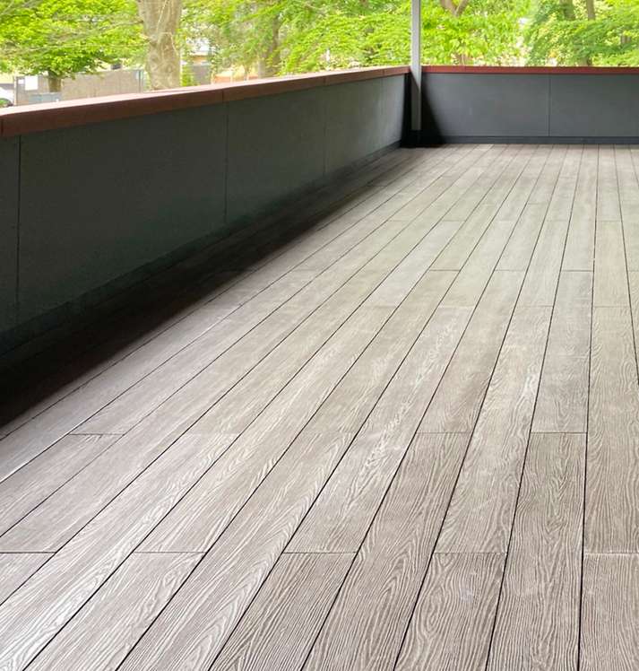 The deck boards are grooved on the underside, fixing onto the metal battens beneath. They click into the specially designed fixing clips. No measuring or constant repositioning is required. Everything is pre-measured and manufactured in the factory. Once the system is delivered, it is impossible to go wrong and the boards always have identical spacing between them.