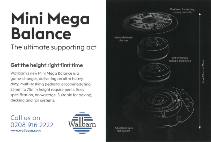 Get the height right the first time. Wallbarn’s Mini Mega Balance is a game-changer, delivering an ultra heavy-duty, multi-tasking pedestal accommodating 25mm to 75mm height requirements. Easy specification, no wastage. Suitable for paving, decking and rail systems.