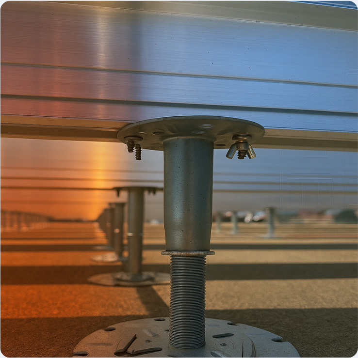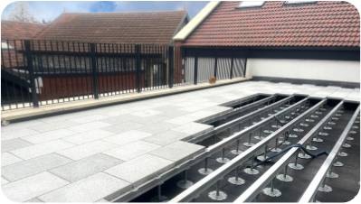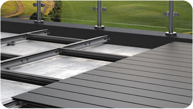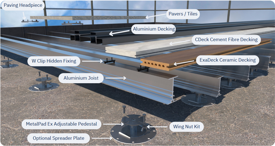 Class A adjustable pedestals, aluminium rails, headpieces & fixings that deliver compliant, flat roof, podium, balcony and terrace finishes